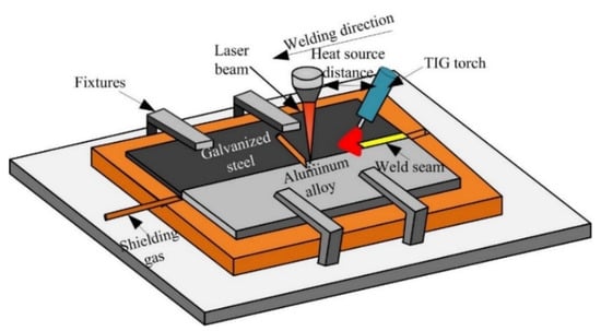 - Li, C.L.; Ding FA, N.; Yu, X.Q.; Huang, J.K. Residual stress and welding distortion of Al/steel butt joint by arc-assisted laser welding-brazing. Trans. Nonferrous Met. Soc. China 2019, 29, 692–700. [Google Scholar] [CrossRef]