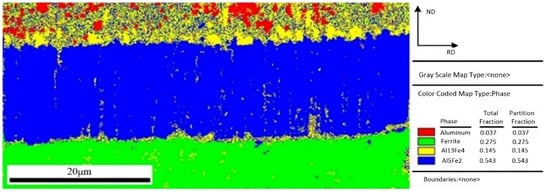 - Yousaf, M.; Iqbal, J.; Ajmal, M. Variables affecting growth and morphology of the intermetallic layer (Fe2Al5). Mater. Charact. 2011, 62, 517–525. [Google Scholar] [CrossRef]