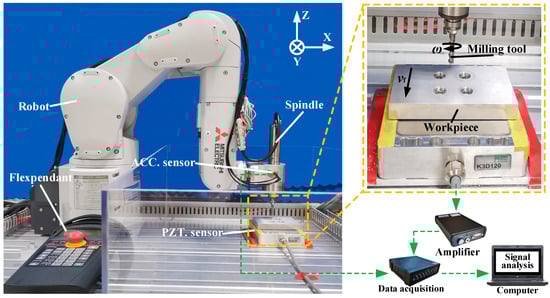 The experimental tests were carried out on a 7075-T651 aluminum alloy using a cemented carbide three-blade milling cutter under dry conditions. The total length of the tool was 75 mm, the blade length was 20 mm with a diameter of 6 mm and the helix angle was 55°. Figure 1 shows the schematic diagram of the experimental setup. The milling tool rotates clockwise and feeds in the negative direction of Y. The dimensions of the workpiece were 100 mm × 45 mm × 15 mm. The nominal chemical composition and material properties of 7075-T651 are listed in Table 1 and Table 2, respectively. The Mitsubishi RV-4FRL-1D-S11 six-axis industrial robot and NAKANISHI spindle were used for milling experiments. The specifications of the robot and spindle are shown in Table 3. The three milling load components (radial load , main milling load and axial load ) were acquired with a three-dimensional piezoelectric sensor (PZT. sensor; type: ME-K3D120). The vibration accelerations were measured with a three-dimensional acceleration sensor (ACC. sensor; type: SD14N20) installed on the spindle, and an UTEKL test system was used for acquiring the milling load signal and vibration signal of the robot during milling with its acquisition frequency of 1280 Hz. Mitutoyo SJ-210 measuring instrument was employed to measure and analyze the roughness of the processed surface. In order to observe the morphology of the processed surface, a KEYENCE VW-9000 high-speed optical microscope was also used.
