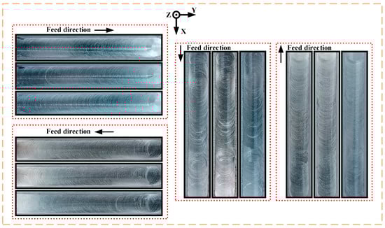 Before investigating the effect of process parameters, exploratory experiments were first conducted on the influence of the robot structure. Among them, the milling depth, spindle speed and feed rate remained the same, and their values were 0.15 mm, 3500 r/min and 45 mm/min, respectively. There were 12 experiments in total, and three repetitive processing experiments were carried out along the positive and negative directions of X and Y, respectively. Figure 2 shows the machined surface results for milling by the robot in different directions.