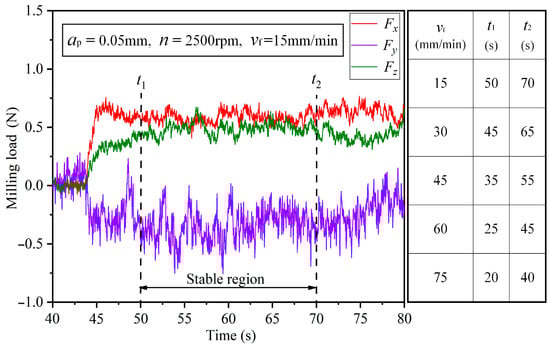 In the milling process, milling load is a critical physical parameter, which directly affects robotic milling performance. Therefore, it is vital to study the contribution ratio of process parameters on milling load. A series of repetitive robotic milling experiments have been performed on 7075-T651 aluminum alloy based on the orthogonal experiment table designed in Table 4. The complete obtained results for milling load, surface roughness and vibration are given in Table 5. As shown on the right side of Figure 1, for each experiment, the signal of the three milling load components were recorded with a piezoelectric sensor. Then the three milling load component signals recorded by the piezoelectric sensor were amplified by the amplifier and then transmitted to the UTEKL data acquisition instrument. The sampling frequency of the UTEKL system was set as 1280 Hz and then the acquired signals were analyzed and processed by the signal analysis software in the computer. Eventually the dynamic response diagram of the milling load over time was obtained. All experimental results were in good consistency. Therefore, a set of relatively stable dynamic curves was randomly selected to analyze the milling load. The stable stage in the response diagram was selected for filtering and noise reduction processing to obtain the average value of milling load. As shown in Figure 3, the stable milling stage from 50 to 70 s in Experiment 1 was selected for calculation. When the feed rate was set to other levels in Table 4, the values of and were selected according to the table on the right side of Figure 3. Finally, the changes in the milling load under different process parameters were evaluated by the resultant load .