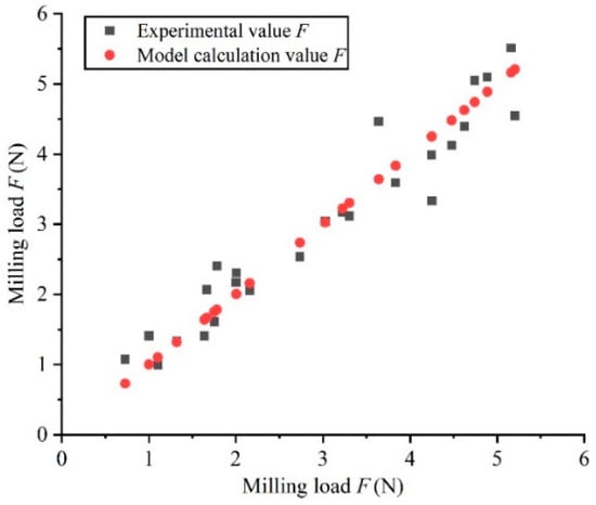 where denotes the cutting force, ; denotes the axial cutting depth, ; denotes the spindle speed, ; denotes the feed rate, ; , , and are constants. Based on the principle of the least square method, according to the milling load data in Table 5, MATLAB was applied to perform the calculation. The result of , , , was acquired. According to the model, the milling load under different milling parameter combinations was calculated, and the calculated values were compared with the experimental values in Table 5, as shown in Figure 4. It can be seen from Figure 4 that the prediction model is highly significant and fits well with the actual situation. The analysis of variance was used for testing to judge the degree of fitting of the model []. It is known that . Under the given significance level , , , so the regression model is credible. Therefore, using this model to predict the milling load when milling the 7075-T651 aluminum alloy has a high degree of credibility.