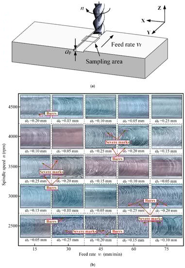 The machined surface morphology under each set of milling parameters. (a) Machined workpiece. (b) Summary of surface morphology in the sampling area.