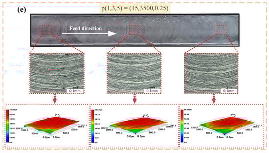 Take Experiments 3, 8, 13, 18 and 23 as examples; the processed surface morphology is shown in Figure 6. The middle of the picture shows the machined surface after 200 times magnification, and the bottom side shows the 3D morphology of the machined surface after 200 times magnification. The surface after milling has obvious tool marks. The evenly distributed tool marks reflect the movement trajectory of the cutting edge of the milling cutter. At the same time, it can be seen that the surface quality at the beginning of milling is poor, and then gradually stabilizes until the tool is completely removed.