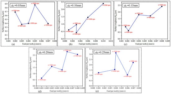 To further investigate the effect of process parameters on the surface roughness, the values of feed per tooth under each experiment were calculated by Formula (8).