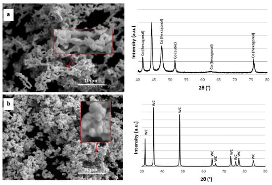 Ultra-fine (<100 nm in size) cobalt powder, WC, and diamond were used to produce the sinter. SEM images and XRD analysis of cobalt powder and WC are presented in Figure 1. Cobalt particles are characterized by an irregular, elongated yet rounded shape. The WC powder used is also characterized by an irregular shape and the powder particles form agglomerates of different sizes.