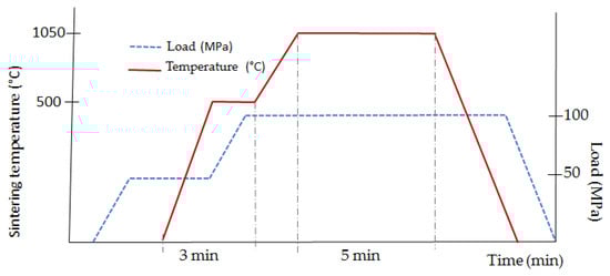 The results of the research presented in the paper [] showed that in order to obtain a solid WC-Co composite, it is enough to carry out the sintering process at a temperature of 1050 °C, under a load of 100 MPa. Therefore, the sintering process of WC-Co composites with diamond was performed in two stages. The degassing stage was carried out at a temperature of about 600 °C for 3 min, increasing the load from 50 to 100 MPa in the second minute. In the second stage, the sintering itself was carried out at 1050 °C for 5 min (Figure 4).