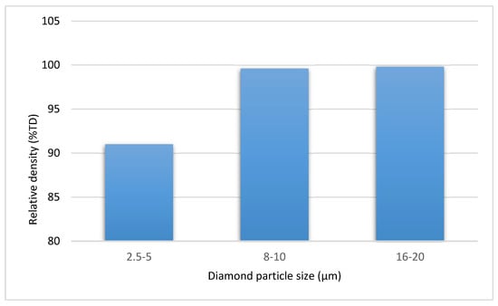 The lowest relative density—91%—was characteristic for composites with the smallest diamond particles, 2.5–5 μm in size. The composites consolidated with the use of larger diamond gradations: 8–10 and 16–20 μm had much higher relative density (above 99% of the theoretical density) (Figure 5).