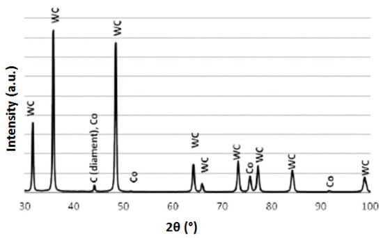 Full diffraction record of the WC-Co composite with 8–10 μm and 16–20 μm diamond, presented in Figure 10, allows the identification of three phases: WC, Co and C (diamond).