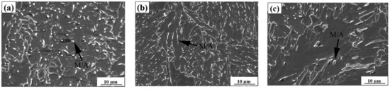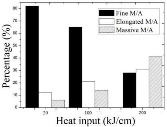 - When the steel was simulated with higher heat inputs (100, 200 kJ/cm), the microstructure of the CGHAZ was predominantly composed of coarse granular bainite and massive MA constituents. The deleterious toughness in CGHAZ with higher heat inputs was mainly caused by the coarser microstructure of the granular bainite and massive MA constituents.