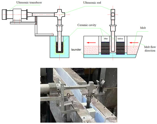 The composition of 7085 aluminum alloy used in the experiments is shown in Table 1. The ultrasonic transducer generates high-frequency longitudinal vibration, which is transformed into high frequency bending vibration by the L-shaped waveguide rod and then introduced into the molten 7085 aluminum alloy in the launder. In addition, a ceramic cavity with a honeycomb channel made of special ceramic material (the diameter of the channel is 6 mm) is arranged in the launder before and after the ultrasonic rod, and the molten 7085 aluminum alloy in the flow tank passes through the front ceramic cavity, the ultrasonic bending vibration rod, and the rear ceramic cavity, and then flows into the crystallizer. Figure 1 is a two-dimensional diagram and a physical photos of the ultrasonic purification device for online purification of the launder.
