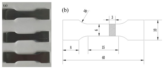 Schematic diagram of the tensile test specimen: (a) physical drawing, (b) dimension drawing.