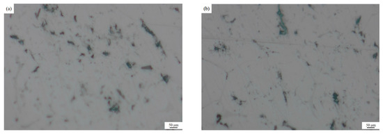 As Figure 7 illustrates, in the specimens before ultrasonic treatment, the inclusions defects mainly consist of some inclusions and gas pores with the size of about 5–15 μm, and there are multiple small size inclusions gathered together. In addition, Figure 7a–c illustrates that the surface burrs of the inclusions defects are more frequent and angular. The inclusions defects in the specimens after ultrasonic treatment are also composed of inclusions and gas pores, which are small in size at about 1–5 μm. It is generally believed that inclusions and gas are interdependent, that there must be gas in the melt, and that more inclusions equal more gas pores [25]. This indicates that after online ultrasonic treatment, the inclusions and hydrogen content in the melt specimens are significantly reduced.