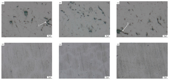 Inclusions in melt specimens before and after ultrasonic purification: (a–c) for specimens (before treatment), (d–f) for specimens (after treatment).