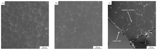 SEM image of the residual aluminum melt sample inside the post-ceramic cavity: (a) central area, (b) transition area, (c) marginal area.