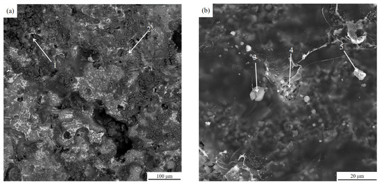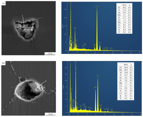 The impurity material defects in the front and rear ceramic cavity residual aluminum alloy specimens were further magnified under a fully automated electron scanning microscope and analyzed by EDS energy spectroscopy, and the results are shown in Figure 10.
