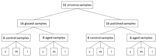 Glazing was performed for all specimens with two thin layers—IPS Ivocolor Glaze Paste (IvoclarVivadent, Schaan, Liechtenstein) in Vita Vacumat 6000 M furnace (Bad Sackingen Germany), in accordance with the manufacturer’s indications. For polishing a low-speed device, polishing brush and diamond paste-Renfert Polish (Renfert, Hilzingen, Germany) was used, following the same technique to obtain a smooth and glossy surface. The final dimensions of plate-shaped samples were 16 mm × 14 mm and 1 mm thickness, andweremeasured with a caliper. For a better understanding a flowchart was created, inwhichthe studied groups are described-Figure 1.