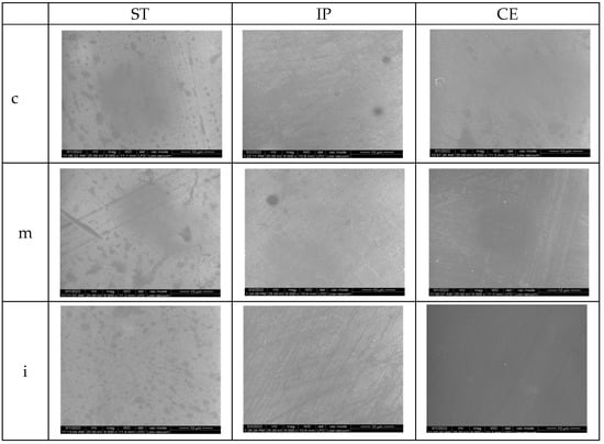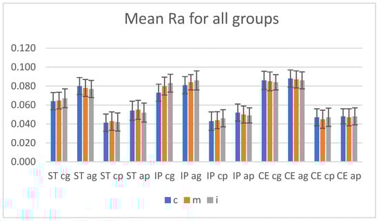 Among the polished tested groups, the lowest Ra values were measured for ST (0.041 to 0.043) and the highest for CE (0.045 to 0.047), which were almost similar in all three areas. For IP, an upward trend was registered, the lowest value (0.043 ± 0.010) was in the cervical area and the highest (0.046 ± 0.009) in the incisal one.