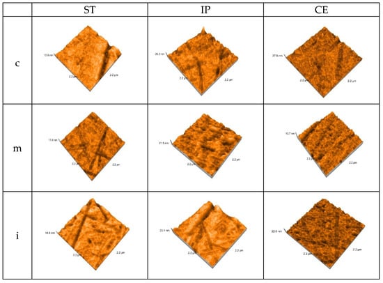 The AFM 3D images on each area of the polished samples of the control group are shown in Figure 4.
