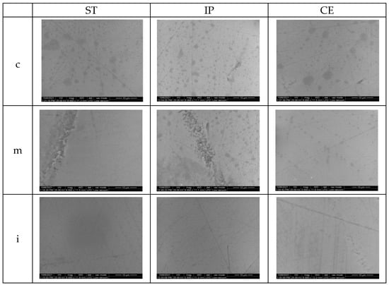 On the polished samples, before aging, the striations, small irregularities, and defects are more obvious than on the glazed surfaces; for ST and IP in medium area, flaws and porosities were observed on the surface.