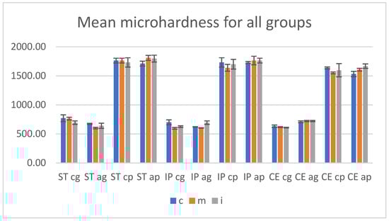 Among polished samples, compared with the situation before aging, the paired t-Test (α = 0.05) reported that the surface roughness values for ST (p < 0.005) increased more than those for CE (p > 0.005) and among materials, the highest Ra values were measured for ST (0.052 to 0.054) and the lowest for CE (0.047 to 0.048); for IP, the values tend to decrease from the cervical (0.053 ± 0.009) to incisal (0.049 ± 0.009) area. This means that the material with 4 mol% Yttrium content is more susceptible to the aging process, thus hydrothermal and mechanical impact cause phase transformation, resulting in surface degradation and an increase in microhardness; this situation has been presented in other studies [,].
