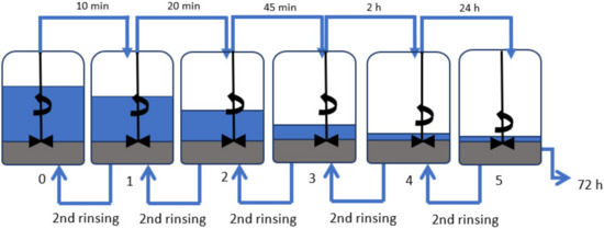 Amorphous diatomaceous earth (Perma-Guard, Bountiful, UT, USA) (28 kg) was placed into Barrel 3 that can hold 180 L, which was then filled with demineralized water to approximately 100 L. The suspension was then mechanically stirred for 3 min (at a speed of 2000 rpm) and left to undergo sedimentation. After 2 h, the supernatant liquid was pumped into Barrel 4 by using a water pump and again left to undergo sedimentation; Barrel 3 was refilled with demineralized water to about 120 L. After 24 h, the supernatant liquid from Barrel 4 was transferred to Barrel 5. The suspension in Barrel 3 was mechanically stirred and, after 2 h, the supernatant liquid was pumped into Barrel 4. The sediment remaining in Barrel 3 was put into Barrel 2, and Barrel 2 was then filled with demineralized water of volume 140 L. As shown in Figure 1, the process was repeated until each sediment had been washed twice. After this event, the sediments were moved into barrels with lower numbers, while the supernatant liquid was pumped into barrels with higher numbers. At the end of the process, the remaining supernatant liquids were decanted, while the sediments were left to dry at 60 °C for 24 h. The obtained filler fractions together with masses of the sediments are shown in Table 1. The material loss of 1358 kg, with an initial input of 28 kg of diatomaceous earth, arises because the smallest particles of diatomite do not sediment completely and they are removed together with the discarded supernatant liquid when pumping out.