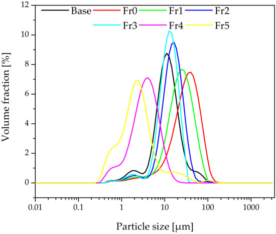 Figure 2 shows the particle sizes of the fractionated diatomaceous earth. The base diatomaceous earth has broken (0.5–2 µm) and unbroken (2–40 µm) frustules alongside agglomerated particles (above 40 µm). The fractionation process results in both the removal of agglomerated particles and the broken frustules depending on the diatomaceous earth fraction. Furthermore, it can be observed that the longer the sedimentation time, the smaller the diatomaceous earth particles (Fraction 4 and Fraction 5 have sedimentation times of 24 and 72 h, respectively), while short rinsing times enable the extraction of particles with larger sizes (Fraction 0 and Fraction 1 have sedimentation times of 10 and 20 min, respectively). Fractions 2 and 3, which have the respective sedimentation times of 45 min and 2 h, do not differ from the base diatomaceous earth in terms of the small particle size. However, it is possible to eliminate the largest-diameter agglomerates. Some of the agglomerations visible in Fraction 5 arise due to a secondary particle aggregation in the water suspension, which was also observed in the previous report [19]. On the basis of DLS and SEM images (discussed in Section 3.1), the SEM images produced (Figure 3) confirm the relationships mentioned above. As the fraction number increases, the diatomaceous earth particle size decreases and the proportion of the broken frustules increases. The SEM image of Fraction 0 clearly shows that a large number of agglomerates formed for both broken and unbroken frustules. Similarly for Fraction 1, the proportion of the largest particle size is smaller, while Fraction 2 and Fraction 3 have similar particle sizes. It is Fraction 2 that has, by far, the most particles with unbroken frustules, which is consistent with the DLS measurements given above. Fractions 4 and 5, as measured with DLS, show the presence of mostly the smallest particle sizes and a high proportion of broken frustules. For Fraction 5, the presence of such small particles results in the further formation of agglomerates. The base diatomaceous earth contains the combination of all the characteristics described above.