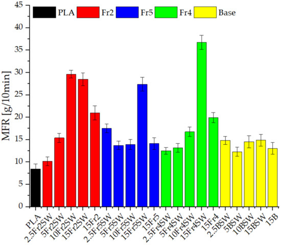 The melt flow rate was measured for the samples after the injection process (Figure 4). It showed significant differences between the samples that were analyzed. The reference polylactide has an MFR value of approximately 8.5 g/10 min, which is slightly higher than the values found in the literature [25], due to the injection molding. Modifications due to the diatomaceous earth result in a significant increase in the flow rate for all the systems. Fractionated systems with added waxes show a mostly linear increase in the value with an increase in the content of diatomaceous earth. Unmodified diatoms, regardless of their concentration, show similar values at −12–15 g/10 min. For Fraction 2 and Fraction 4, the effect of the addition of the synthetic wax on the MFR values is observed (15Fr2 and 15Fr4 systems compared to 15Fr2SW and 15Fr4SW), i.e., the value increases dramatically (from 20.978, 19.940 to 29.978, 36.747, respectively). Furthermore, the addition of the diatomaceous earth alone increases the melt flow rate, even without the addition of the waxes. This can be seen by comparing the systems that contain 15% diatomaceous earth without wax and with lower concentrations of wax (2.5% and 5%). The diatomaceous earth particle size has a significant effect on the processing parameters. As mentioned above, base diatomaceous earth is characterized by the lack of correlation between its content and an increase or decrease in the MFR, while the system that contains the larger particle sizes (Fraction 2) already clearly display improved properties at a concentration of 10%.