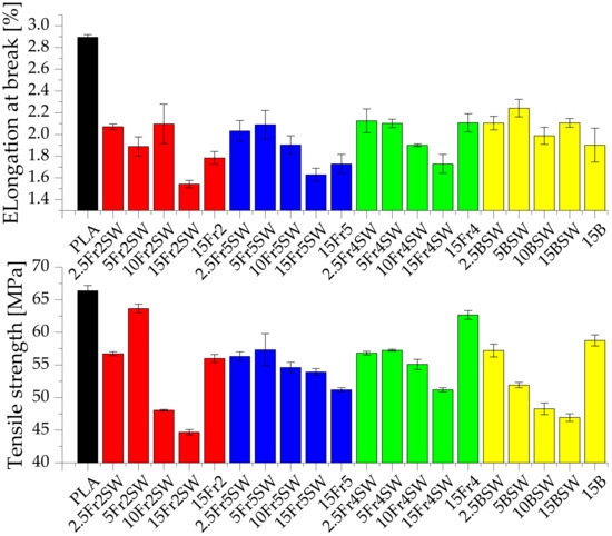 A study was conducted to investigate the effect of the particle size on the mechanical properties of the composites (Figure 5, Figure 6, Figure 7 and Figure S1). It is shown that the diatomaceous earth decreases the strength of the material due to, among other factors, the application of rigid particles as the filler, the presence of air in the frustule, and the tendency of the diatomite to agglomerate, which increases the concentration of the point stresses. The last aspect is the lack of chemical surface treatment of the filler, resulting in limited adhesion on the composite interphase. This implies that pure polylactide shows both a higher elongation at break and tensile strength parameters [26]. When using diatomite loadings in the range of −2.5–15%, we can conclude that the optimum amount of additive, for testing mechanical properties at the break point, includes the addition of 5% fractionated diatomaceous earth. However, the base diatomaceous earth shows an inverse relationship between the tensile strength and concentration. The aspects of the PLA-diatoms interaction and the mechanical behavior of PLA-diatomaceous earth, as well as the filler particle size distribution, have been discussed in detail in the previous work [19]. The addition of the synthetic wax (WTH-B) has a significant effect on reducing the mechanical strength of the systems under investigation, while improving the flow rate. The systems modified with Fraction 2 (5% of the additive), i.e., with a medium range of particles but without any agglomerated particles, have the highest parameters, while Fraction 5 (the smallest particles) boasts a relative stability based on their measurements irrespective of the additive concentration.