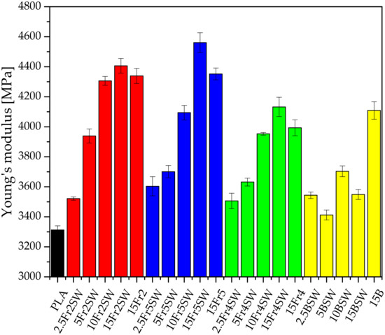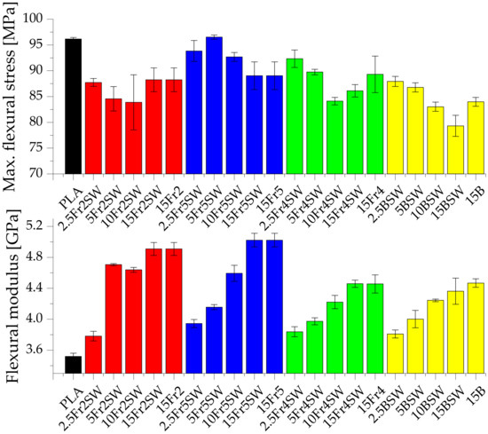 The flexural strength of the composite systems is also examined. Pure PLA is characterized by the flexural modulus and maximum flexural stress values of 3.52 GPa and 96.15 MPa, respectively. Systems filled with diatomaceous earth, with the addition of synthetic wax, have lower maximum flexural stress values compared to pure polylactide (except for the system 5Fr5SW at 96.53 MPa), which is due to the low adhesion of the polymer to the filler particles. Compared to the tensile tests, the synthetic wax does not cause a significant deterioration in the mechanical parameters relating to flexure. However, the particle size of the filler has a significant effect on the flexural strength of the systems. Fraction 2, which has the highest average particle diameter, causes the greatest decrease in the tensile strength parameters for the highest filling. In each case, the flexural modulus is higher for the filled samples compared to the base PLA (which is typical for filled composites), with an increasing trend with more filling. Moreover, the fractions with the largest and smallest particles show the highest values of the flexural modulus, especially for the highest concentration (15%). The systems that are modified with the base diatomaceous earth, and Fraction 4, show a similar tendency.