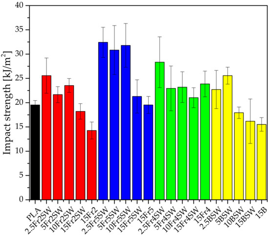 The addition of diatomaceous earth to the polylactide, irrespective of the fraction, results in an initial increase and then a decrease in the impact strength at most concentrations (Figure 8). The optimum results are obtained for the fraction with the smallest particles, in the filling range up to 10%. The impact strength of the obtained samples is undoubtedly influenced by the particle size of the diatomite and its agglomeration. The fraction that contains the largest-diameter particles has the lowest impact strength parameters, but this is only slightly lower than the systems with the base diatoms, which indicates that the presence of large-diameter particles has a negative effect on the impact strength.