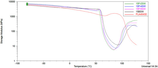 Based on the DMTA curves at normal scale, cold crystallization and subsequent melting are observed after the glass transition temperature. In the process of cold crystallization, a new fraction of crystallites is formed due to improved mobility and ordering ability of the polymer chains in the amorphous phase, which consequently results in an increase in modulus, and a significant peak in the tan delta curve is observed, with an onset at ~90 °C for PLA composites. This phenomenon was discussed in the review by Cristea et al. [28]. As the DSC and DMTA measurements are based on different measuring principles, the cold crystallization event during the DSC measurement occurs at a slightly different temperature. Crystallites that form at relatively low temperatures during cold crystallization are not stable and undergo crystal perfection. Then, as the temperature increases, the decrease in the modulus indicates the beginning of the crystallite melting process.