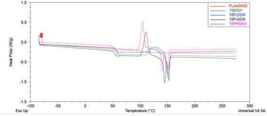 With a further increase in the temperature, the crystals that are generated during cold crystallization begin to melt. As a result, a melting peak appears in the DSC thermograms. It can be observed that the unmodified PLA and the 15Fr2SW composite show a single melting peak, and its melting temperature (Tm) is around 150 °C. While the PLA/GF composites reveal a double melting peak with two melting temperatures (Tm1 and Tm2), the double melting peak could be related to the recrystallization of the generated crystals. For the 15Fr4SW and 15Fr5SW composites that crystallize around 110 °C, the crystals typically show a less-than-perfect structure and they are much thinner than the crystals generated at the higher temperatures during cold crystallization. However, these thinner crystals can melt and recrystallize to generate a closer to perfect and thicker structure. Due to a temperature increase, melting again occurs and the second melting peak (Tm2) is achieved [32,33].