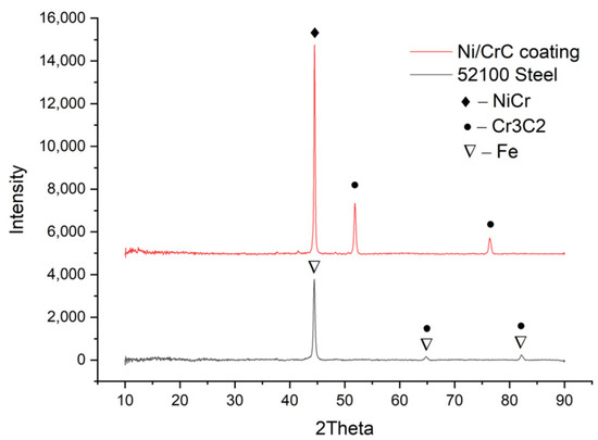 Figure 1 presents the diffractograms for the base and coating material. Knowing the chemical composition of the powder [20], the predominant phase of NiCr (cubic structure -ICDD 96-901-2971) was obtained at a 2 Theta angle of approximately 44° and the secondary phase of Cr3C2 (cubic structure-ICDD 96-901-1599) at a 2 Theta angle of approximately 53° and 77°. In the case of the basic material, the predominant phase is Fe (cubic structure -ICDD 96-901-6602), around the 2 Theta angle of 45°, and the secondary phases contain Fe and Cr3C2 at the 2 Theta angles of 65° and 83°.