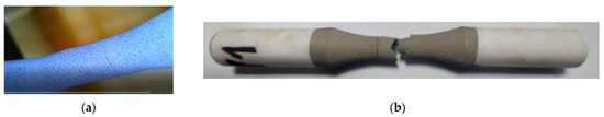 Sample subjected to static tensile load. (a) Image from the video that captures the moment of cracking of the coating material at the static tensile load; (b) broken sample after static tensile.
