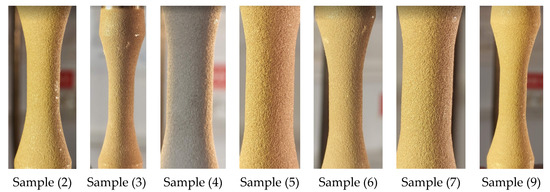 Samples 1 and 8 did not break even after more than five million cycles of stress reversals. Examining the outer surface of the sample, no damage to the coating material was found (Figure 9). For Sample 1, the coefficient resulting from the ratio of the test loads to the yield limit is: KσF = σtest/σy = 438/831 = 0.53. As a result, we can state that when the loading is at 53% of the yield limit, and if the sample doesn’t fracture, the coating material withstands high values of the number of cycles, not causing significant damage to the surface. This statement must be taken with caution, since it is not known what happens at the interface between the two materials, in the area where the first plastic deformations of the base material occur. At low loads, in the elastic region, the deformations of the base material are not very different from the deformations of the coating material [19]. Under these conditions, the tension and compression of the coating materials are similar to the expansion and compression of the base material. Although the stress is applied over 5 million cycles, the loads being low, the coating material withstands very well within the stresses of cyclic fatigue, without experiencing significant damage.