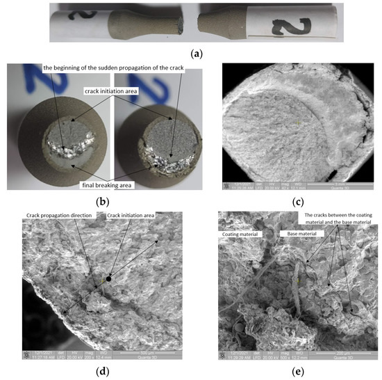 Microscopic observations: In the final fractured surface, large damage to the coating material is noted (Figure 11c). For all samples, the large damage to the coating material in the final fracture surface is due to the large deformation differences between the base and coating material. The base material having a high deformation (in the plastic domain) in the final fracture surface, also trains the coating material. Thus, the coating, not being able to deform in the same way as the base material, deteriorates by the appearance of large cracks. In the area of crack initiation (Figure 11d,e), there is no significant damage to the coating material. Detachment of the coating material from the base material due to the deformation differences between the two materials is observed.