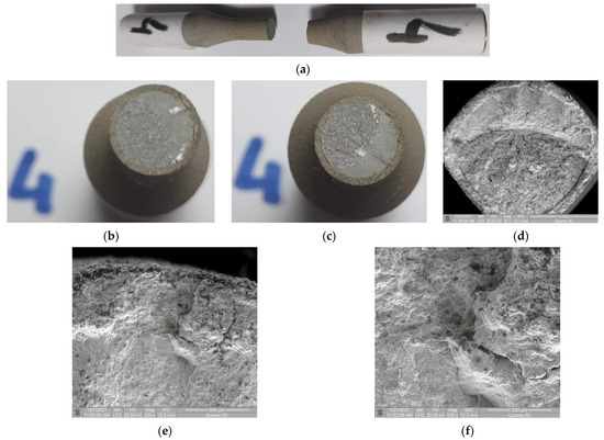 Macroscopic and microscopic appearance of broken surfaces for Sample 4, σmax = 477 MPa, N = 878,965 cycles. (a) Sample 4 broken by fatigue. (b,c) Fracture surfaces. (d) SEM image of the fracture surface at 42× magnification. SEM image of the area where a crack initiated with (e,f) 200×, and 500× magnification.
