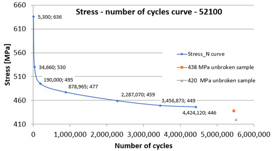 As mentioned earlier, the tests were conducted from higher stress values (resulting in lower values of the number of stress cycles) to lower stress values. The stress cycle values of 5 million have been set as a limit. If the sample did not brake up to this number of stress cycles, the test was stopped, regardless of the stress values. Table 2 shows the number of cycles to failure for each maximum stress level.