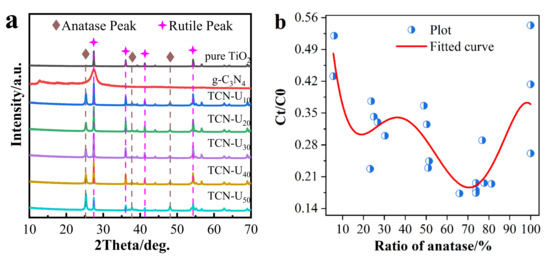 (a) XRD patterns of pure TiO2, g-C3N4 and TCN-Ux and (b) fitted curve between photocatalytic degradation efficiency of AAF and ratio of TiO2 anatase.
