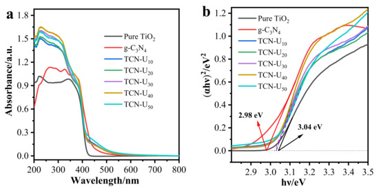 The ultraviolet light absorption intensity of all TCN samples was much stronger than pure g-C3N4 and TiO2 as shown in Figure 3a and Figure S3a–c suggested the doped of g-C3N4 enhanced the UV-light absorption intensity significantly. Furthermore, the bandgap was calculated by the Kubelka–Munk function Equation (1) as follows: