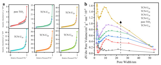 N2 adsorption-desorption isotherms and pore size distribution of TCN-Ux and pure TiO2 showed in Figure 4. The BET fitted curve and specific surface area data of TCN-Ux are exhibited in Figure S4, Table 2 and Table S2. Compared with pure TiO2, SBET of TCN increased 3–7 times after g-C3N4 doping. All samples showed the typical IV isotherm with H1 hysteresis loops reflecting the existence of homogeneous mesoporous. The hysteresis loops were caused by capillary condensation in the relative pressure (P/P0) range of about 0.5–1.0. The results suggested that TCN has a bigger specific surface area and smaller pore size than pure TiO2. TCN performed high photocatalytic activity demonstrated by a bigger specific surface area, more abundant mesoporous structure, and more adsorption sites [39]. The increase of SBET was attributed to covered g-C3N4 increased with doping ratio, and growth of TiO2 anatase with heating rate sped within range of 10 °C/min. The decrease of SBET was due to the growth of TiO2 rutile with a heating rate speed from 10 to 25 °C/min, calcination temperature raised from 450 to 650 °C, and heating preservation hour increasing from 2 to 7 h. The results were consistent with the XRD and SEM characterization of the samples.
