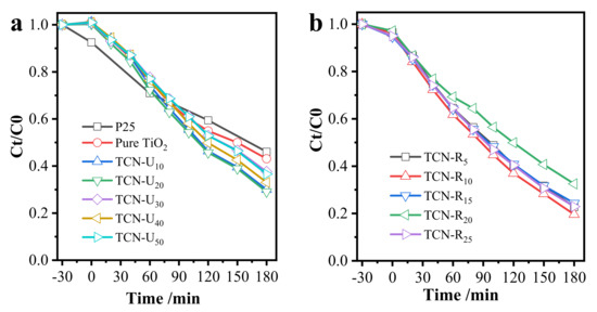 The photocatalytic degradation of AAF by TCN (Figure 5) was always higher than by commercial TiO2 (P25) and pure TiO2 prepared, which might be attributed to the formation of the TiO2/g-C3N4 heterojunction [29,44,45,46,47]. The TCN samples with a 20 doping ratio, 10 °C·min−1, 550 °C, 6 h in the same three other conditions showed the optimum photocatalytic degradation efficiency.