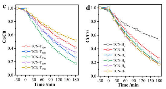 X’TRA rotating anode powder X-ray diffraction (XRD, PANalytical B.V., X’Pert powder) with Cu Kα radiation (λ = 0.154056 nm) in the diffraction angle range of 2θ = 10~90° with 0.02° interval. The sample’s phase and composition were identified by it. The morphology of TCN was exhibited by scanning electron microscope (FE SEM, Tescan, Brno, Czech Republic, MIRA3 LMH). Crystal and element imaging of samples were shown via transmission electron microscope (TEM, FEI, Tecnai Hillsboro, USA, G2-20) connected with a CCD camera from Gatan Company (Pleasanton, CA, USA) and X-ray energy dispersive spectrometer from EDAX Company. Ultraviolet-visible diffuse reflectance spectrum (UV-Vis DRS, Shimadzu, Kyoto, Japan, UV-2600PC) was employed in the range of 200~800 nm with 1 nm interval to obtain the optical absorption spectra of materials, and BaSO4 was used as the reference. The Brunauer–Emmett–Teller (BET) surface area and Barrett–Joyner–Halenda (BJH) pore width were analyzed by Micromeritics ASAP 2460 nitrogen adsorption apparatus. X-ray photoelectron spectroscopy (XPS, Thermo, Waltham, MA, USA, ESCALAB 250Xi) spectra were operated with a monochromatic Al Kα radiation source (1486.6 eV) and the binding energies were adjusted with C1s (284.8 eV). Electrochemical impedance spectroscopy (EIS) was analyzed by three-electrode cell electrochemical workstation (CHI-660E, Chinstruments, Shanghai, China) with Pt and saturated calomel electrode as the counter and reference electrode, and 0.1 mol·L−1 Na2SO4 aqueous solution as electrolyte. The sample (10 mg) was dispersed in 1 mL ethylalcohol with ultrasonic for 30 min, and then the mixture was dispersed uniformly on the indium tin oxide (ITO) glass as a working electrode within a 1.0 cm2 area.