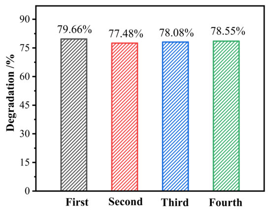 The stability of the photocatalyst is an important index to estimate the photocatalytic activity so it is significant to study the recycling of the TiO2/g-C3N4 composite. At room temperature, TCN-T550 (30 mg) was added to a 50 mL AAF solution (100 mg·L−1). The catalyst used was collected and reused in the next degradation experiment. The results of reusing catalyst photocatalytic activity were showed in Figure 6. After four times of recycling, the TiO2/g-C3N4 composite photocatalytic degradation efficiency of AAF was always steadily high, indicating that the TiO2/g-C3N4 composite is a kind of potential photocatalyst for practical engineering application.