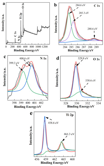 XPS of survey (a), C1s (b), N1s (c), O1s (d) and Ti2p (e) scans of TCN-T550.