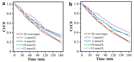 Research of photocatalysts’ reactive active species in the photocatalytic degradation process is the fundamental research of photocatalytic mechanism. As we all know, ammonium oxalate is the quenching agent of hole (h+), and isopropanol is the quenching agent of hydroxyl radical (·OH). The results are shown in Figure 9.