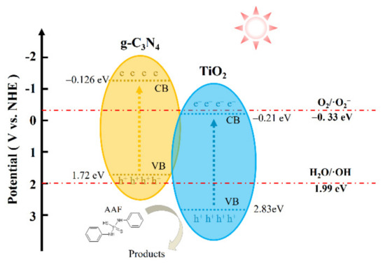 where EVB, ECB, χ, Ee and Eg were the VB edge potential, the CB edge potential, the geometric mean of Mulliken electronegativity [53], and the energy of electrons on the hydrogen scale (~4.5 eV, vs. NHE) and optical bandgap energy. The value of χ of TiO2 and g-C3N4 were 5.81 eV [54] and 4.73 eV [55]. The EVB of TiO2 and g-C3N4 were 2.83 eV and 1.72 eV, and the ECB of TiO2 and g-C3N4 were calculated as –0.21 eV and −1.26 eV, respectively. The VB potential of TiO2 (2.83 eV) is more positive than H2O/·OH (+1.99 eV vs. NHE), and the CB potential of g-C3N4 is more negative than O2/·O2− (−0.33 eV vs. NHE) [56], so there was an oxidation reaction in the VB of TiO2 and reduction reaction in the CB of g-C3N4. This result and the results of photocatalysts reactive active species confirmed each other. TiO2 and g-C3N4 might form type-II or direct Z-scheme heterojunction. If it belongs to type-II heterojunction, e− on the CB of g-C3N4 would transfer to the CB of TiO2 and h+ on the VB of TiO2 would transfer to the VB of g-C3N4. However, the VB potential of g-C3N4 (1.72 eV) is more negative than H2O/·OH (+1.99 eV vs. NHE) and cannot produce ·OH which was the active species. The conclusion is contradictory to the result of the quenching experiment. So, the possible photodegradation mechanism process was conjectured as a direct Z-scheme heterojunction shown in Figure 10 [57] and following Equations (4)–(8):