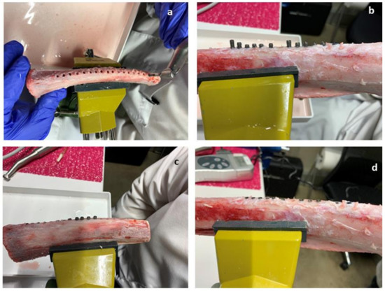 A total of 90 dental implants were implanted in 7 fresh cow ribs (15 for each rib) with a distance between implants of 9 mm. The cow ribs present a length range from 210 mm to 230 mm. The bone density was homogenous in all the segments and ribs. The surgeries were realised by the same researcher (J.A.C.). The process of implantation is shown in Figure 2 using a GENTLEsilence LUX 8000B turbine (KaVo Dental GmbH, Biberach an der Riβ, Germany) under water irrigation at 22 °C [37].