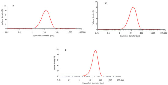 (a) Granulometry for Ti-5 μm, (b) Ti-15 μm, and (c) Ti-30 μm.